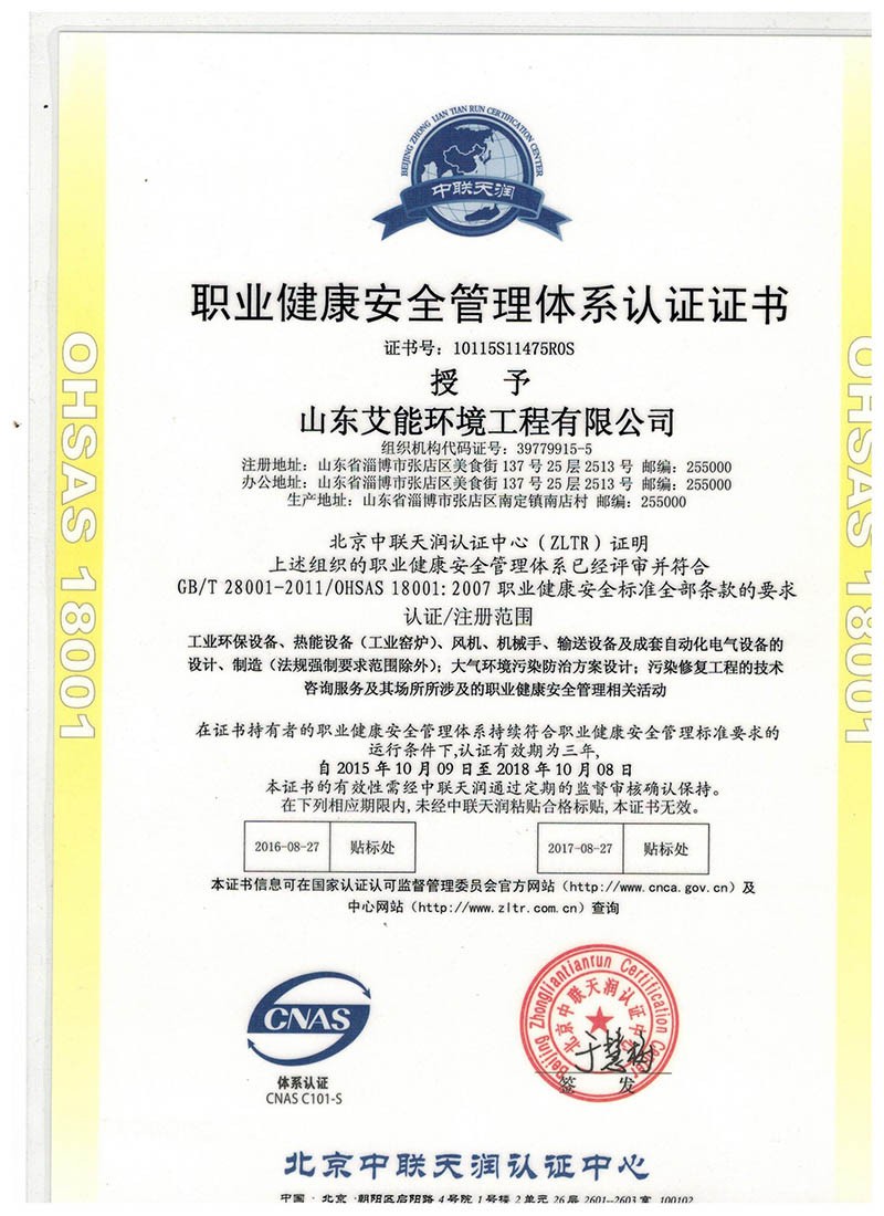 職業健康安全管理體系認證證書